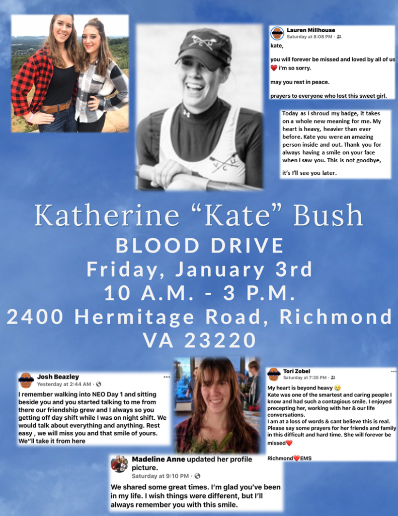 The Richmond Ambulance Authority held it’s blood drive in honor of EMT Katherine “Kate” Bush who recently passed away. Staff members donated blood in her memory. Her family says she was a always a giver, and donating blood in her name was the perfect way to honor her. We surpassed our goal and even had to turn some walk-ins away because so many committed to donating. We collected enough blood to potentially save 93 lives! You can always consider donating by visiting redcrossblood.org