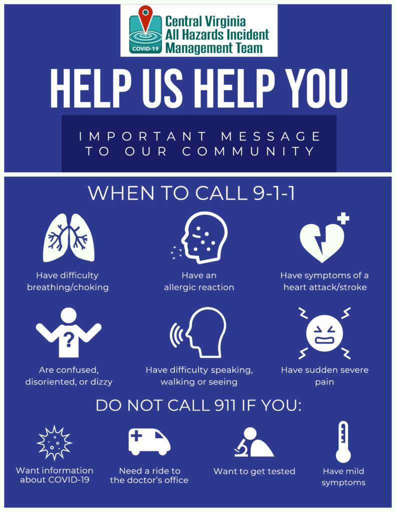 For information about COVID-19, including testing, citizens are asked to call the Virginia Department of Health (VDH) at 877-ASK-VDH3 (877-275-8343) and not 911.